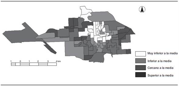 Ahora bien, para lograr una acabada aproximación a la pobreza en la ciudad de Neuquén hacia comienzos de los ochenta resulta necesario sintetizar la multiplicidad de indicadores que hasta aquí hemos utilizado. Un desafío de esta naturaleza nos obliga a dejar de lado los estudios que se basan en una sola variable y a abrazar la opción de un análisis multivariado. En función de las características de la documentación con que contamos se nos ocurre que una estrategia válida para obtener un indicador único es a partir de lo que algunos autores han denominado "valor índice medio" (VIM) (García de León, 1989: 69-87; Buzai y Baxendale, 2006: 271-274). En términos de García de León, se trata de una técnica que apunta a "clasificar un conjunto de unidades territoriales con base en un índice a partir de la información que aportan diferentes variables" (García de León, 1989: 69). Para obtener un VIM que nos brinde pistas sobre la pobreza resulta esencial en primer lugar estandarizar las tres variables seleccionadas para obtener como resultado un conjunto de puntuaciones de media 0 y desviación estándar 1.6 Cuando las variables resultan comparables entre sí es preciso ubicar a cada uno de los puntajes obtenidos en cinco intervalos: 1) muy inferior a la media (valores inferiores a -1); 2) inferior a la media (valores entre -1 y - 0.5); 3) cercano a la media (valores entre -0.5 y 0.5); 4) superior a la media (valores entre 0.5 y 1); y 5) muy superior a la media (valores superiores a 1). Por último, luego de promediar cada uno de los nuevos puntajes para cada radio censal analizado alcanzamos el VIM de la pobreza. El índice que se obtenga puede oscilar entre 0 (realidad de nula pobreza) y 5 (realidad de considerable pobreza).