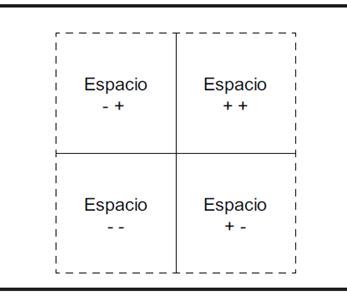 En términos prácticos el valor de r puede variar entre 1 y -1. El límite superior nos habla de una relación de muy alta intensidad en un sentido positivo, mientras que el inferior refiere a dos variables fuertemente vinculadas, pero en un sentido inverso. Cuando el valor de r es cercano a 0 no hay correlación entre ambos conjuntos de datos. Como complemento visual del análisis bivariado usaremos gráficas de dispersión (scatter diagram), cuya aplicación da como resultado un eje ortogonal y una serie de puntos que coinciden con cada una de las unidades espaciales analizadas (las coordenadas de los mismos están dadas por los valores de las variables escogidas en esa área de la ciudad) (Buzai y Baxendale, 2006: 151). Como los datos de cada variable se transforman en puntajes estándar, los ejes toman el lugar central de la gráfica y quedan a la vista cuatro cuadrantes (Figura 1). El cuadrante inferior izquierdo concentra las unidades espaciales con bajos valores en ambas variables; el cuadrante superior izquierdo aquellas que exhiben bajos valores en x y altos en y; el cuadrante superior derecho alberga los valores altos en ambas variables, y el cuadrante inferior derecho presenta valores altos en x y bajos en y (Figura 1). En pocas palabras, esta gráfica nos permite visualizar qué tan alejados están los valores de la media de cada una de las variables representadas en los ejes de las abscisas y las ordenadas (y = 0 y x = 0).