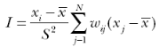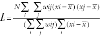 donde: N es el total del número de áreas, 𝑤𝑖𝑗 es la medida de peso espacial de la contigüidad; xi y xj denotan los valores observados para las áreas i y j respectivamente, y x es el promedio de los valores de los atributos.
