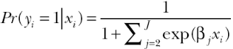 donde Pr (yi = m | xi) es la probabilidad del resultado m de una variable dependiente con J resultados, dado un vector de variables independientes xi. Los betas representan el cambio en el log-odds de pertenecer a un grupo en relación con la categoría base como el valor de los cambios en la variable xi por cada unidad.