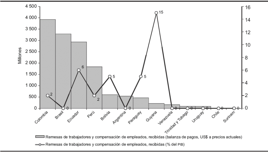 La relevancia de las remesas internacionales en la economía paraguaya se presenta en la Gráfica 1. Con datos del Banco Mundial, la gráfica presenta la importancia de las remesas según el producto interno bruto (PIB), en países seleccionados de América del Sur. Como puede observarse, Paraguay es uno de los países del Cono Sur donde las remesas tienen un papel de importancia en relación con el PIB, 5%. Si analizamos de manera comparativa con otros países, en Bolivia se observa la misma relevancia en cuanto al porcentaje del producto interno bruto.