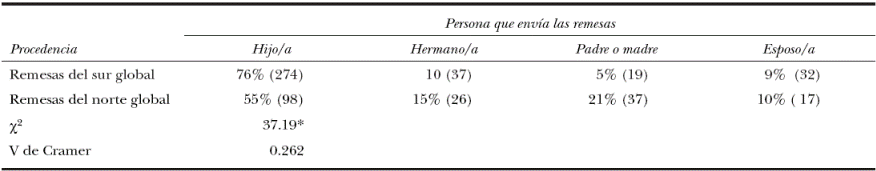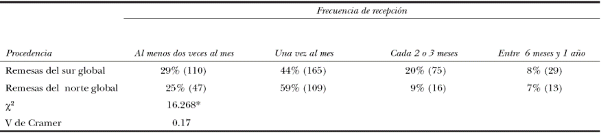 La evidencia empírica analizada sugiere que existen diferencias sociodemográficas y socioeconómicas entre los hogares vinculados al norte global y aquellos relacionados con el sur global. El principal destino que se da a las remesas internacionales es en bienes de consumo y esto es más acentuado en los hogares receptores del sur global. Es decir, el estatus económico de los receptores condiciona el uso de las remesas. Mientras que los hogares con mejor posición socioeconómica y que reciben del norte invierten un porcentaje mayor en actividades consideradas productivas, aquéllos con niveles socioeconómicos más bajos y que reciben del sur invierten en satisfacer necesidades de consumo básicas. La frecuencia en la recepción indica que mayoritariamente son un reemplazo del salario y que esto es más acentuado en los hogares receptores del norte.