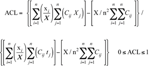 4) Finalmente, se calcula un índice de agrupación espacial, que expresa la media de individuos del grupo x de cada sección como proporción de la población total de las secciones vecinas. Es el Índice de Agrupamiento Absoluto (ACL) (Massey y Denton, 1988; Dacey, 1968; Geary, 1954):