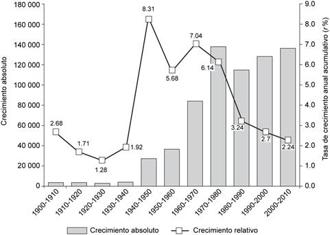 Gráfica 1: Incremento poblacional, en cifras absolutas y relativas (tasa de crecimiento anual acumulativo)
