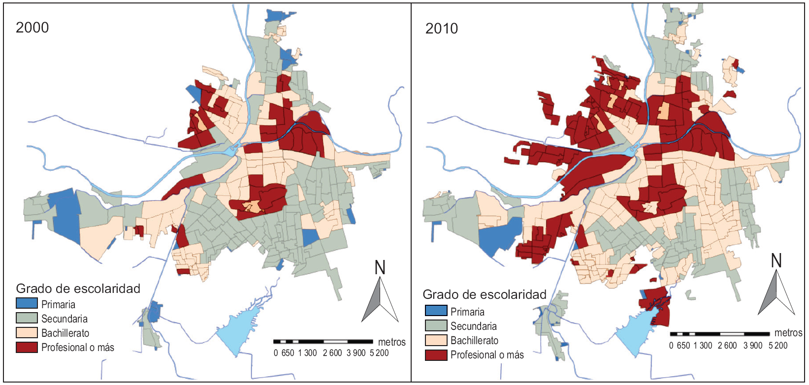 La distribución de la población entre los dos censos muestra que las AGEB situadas en zonas más céntricas, que ya eran de las menos pobladas en el año 2000, han continuado perdiendo población, debido en parte a su conversión en áreas mayoritariamente comerciales. Sin embargo, las zonas menos pobladas son, tanto en un año como en el otro, las más periféricas, de poblamiento reciente y quizás todavía no consolidado (Mapa 1). Por el contrario, en el año 2010, y a diferencia de lo que sucedía en el 2000, la población se encuentra más dispersa sobre el territorio, encontrándose AGEB con más de 5 000 habitantes en las periferias sur, este y oeste (pero no en los barrios más periféricos), siendo la periferia norte la única que no cuenta con tales concentraciones demográficas.