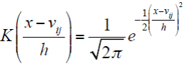 donde n es el número de unidades espaciales consideradas en el análisis (v. g., los 2 456 municipios de México), v ij se refiere a cada una de las observaciones de la variable j (v. g., las TNMR) y h es el parámetro que suaviza el comportamiento de los datos para ajustarlos a una función no paramétrica. La variable v ij se normaliza a partir de su media.