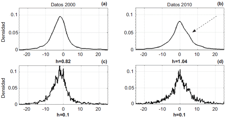 Tomando como referencia el criterio de Silverman (1986), en la Figura 1 se observa el suavizado variando el parámetro h. La Figura 1 (c, d) corresponde a un estimador infrasuavizado h = 0.1 para los años 2000 y 2010, respectivamente. Estos gráficos registran un gran número de oscilaciones que corresponden a falsas modas. El número de éstas aumentaría si se disminuyera aún más el valor de h.