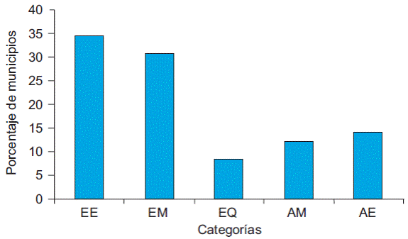 En el periodo 2000-2010, 307 municipios se encontraban en la categoría de expulsión elevada (EE), lo que equivalía a 36.1% del total de la categoría (Cuadro 2)14. La proyección (Cuadro 3) indica que para 2020 la probabilidad de que los municipios de EE permanezcan en esa categoría se reduce a 22.2%. Debe destacarse que estas transiciones se registran sobre todo hacia las categorías de atracción media (AM) y, notablemente, atracción elevada (AE). La probabilidad de transitar a AM subiría de 17.8 a 23.6%, y la de pasar a AE se elevaría de 16.1 a 27.1%. En síntesis, la proyección sugiere una redistribución progresiva importante de condiciones para vivir/trabajar en beneficio de los municipios más débiles de la década anterior. Es decir, en términos endógenos y exógenos estos municipios serían mejores (o menos adversos) lugares para vivir/trabajar que en el periodo anterior.