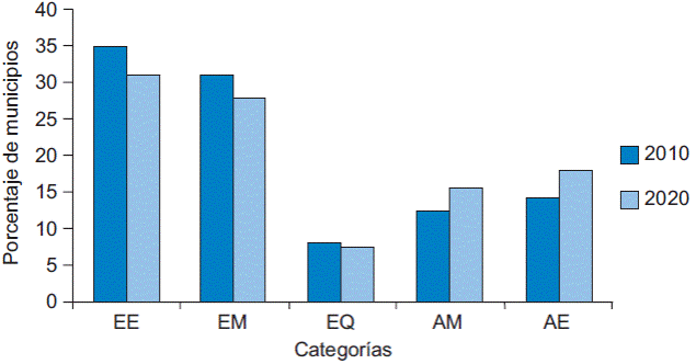 La Figura 5 sintetiza la tendencia del cambio de perfil de la distribución de los municipios entre las categorías migratorias: entre 2010 y 2020 se registra un desplazamiento de los municipios de expulsión hacia las categorías de atracción. Seguramente esta tendencia será aún más clara en la proyección de largo plazo.