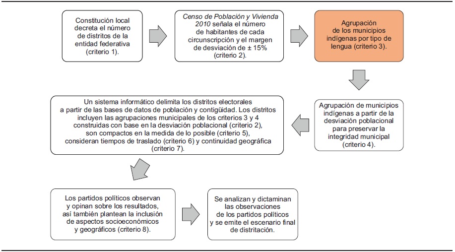 Cabe mencionar que hubo variaciones en los criterios para las distritaciones federal y locales. Primero se definieron los criterios para las locales, en las que se incorporó a los municipios con más de 40% de población indígena para procurar la conformación de distritos indígenas, es decir, agrupaciones de municipios cuya suma de población indígena sea de 40% o más. En los criterios para la distritación federal se agregó la lengua predominante; el objetivo fue demarcar distritos cuya suma de población indígena sea mayor a 40% y que, además, en la agrupación de municipios predomine la misma lengua. Aun cuando el criterio etnolingüístico forma parte de los criterios de distritación federal, también se aplicó en el ámbito local.