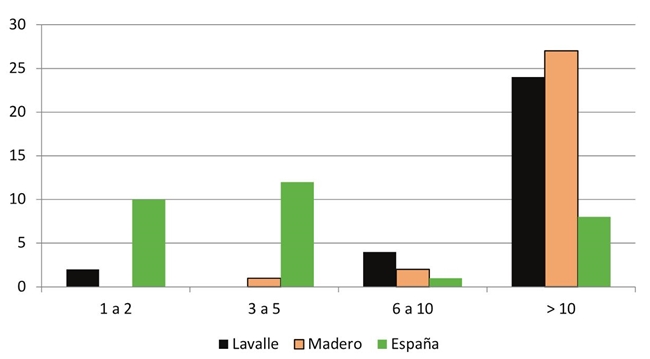 En cuanto a la proximidad, está relacionada con el concepto de espacio público de éxito (Pérez, 2004), en el sentido de que debe existir una relación entre afluencia de visitantes y tiempo de permanencia con la distancia recorrida para llegar a la plaza; sin embargo, esta tercera variable no necesariamente condiciona las otras dos. Así, en el caso de este estudio, a la pregunta: ¿a cuántas cuadras de la plaza está su vivienda?, la mayoría de las personas presentes en las plazas Lavalle y Madero Harbour contestaron haber recorrido más de diez cuadras (Gráfica 1), de manera que las motivaciones para llegar hasta aquí y permanecer hasta cuatro horas o más deben superar el inconveniente de la distancia. Esto contrasta con las personas que acuden a la Plaza España, donde el recorrido apenas supera las cinco cuadras (Gráfica 2).