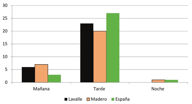 Seguramente es la proximidad lo que explique que las personas que frecuenten la Plaza España permanezcan en la misma un tiempo menor, pero con visitas más frecuentes a lo largo de la semana (Gráfica 3), mientras que en las que el recorrido es largo, el tiempo de permanencia es mayor y menor la frecuencia con la que se visita; es decir, su uso forma parte de la cotidianidad, frente a las que después de un mayor recorrido entienden el “estar” como algo menos fugaz. En cualquier caso, se trata de visitas en horario de tarde, aspecto que no estaría relacionado con la proximidad ni con el tiempo de permanencia (Gráfica 4). Tanto la frecuencia “dominguera” -asimilada a la respuesta de “un día a la semana”- como la diaria, indican que las plazas son espacios de interés para la ciudadanía, escenarios de sociabilidad que forman parte de prácticas cotidianas.
