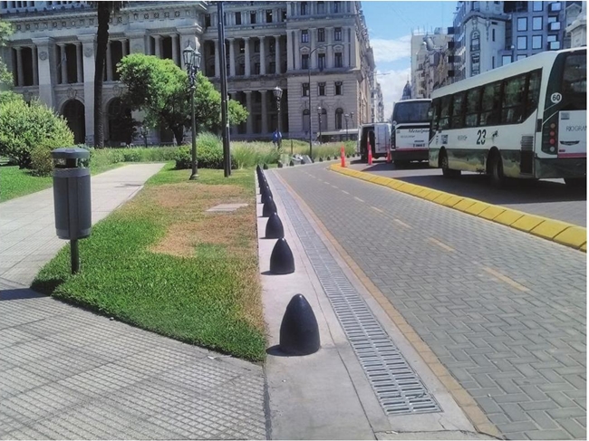 La segunda variable de sociabilidad que se destaca tiene que ver con su diseño en relación con la movilidad urbana. La plaza se divide en tres espacios atravesados por dos vías principales en dirección occidente-oriente (vía Tucumán y vía Viamonte) (Fotografía 5). Estas fronteras internas, además de “compartimentar” en tres espacios la plaza, potencian su uso en relación con las rutas de buses, las líneas del metro subterráneo, los trayectos peatonales largos y las ciclorrutas.