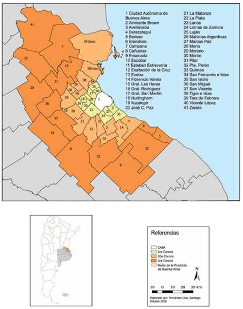 Mapa 1 Partidos y división en coronas de la Región Metropolitana de Buenos Aires Fuente:Instituto del Conurbano, 2016.