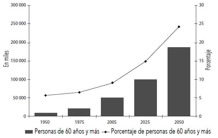 En el contexto latinoamericano, la población urbana alcanzará 87%. Y conforme las ciudades crecen, el ritmo de personas mayores va en aumento. Uno de cada cuatro latinoamericanos será una persona mayor en el año 2050; en términos absolutos, a los 41 millones existentes se sumarán 57 millones de personas mayores entre 2000 y 2025; y entre 2025 y 2050 el aumento será de 86 millones, a un ritmo medio anual de 3.5% (CEPAL, 2009). Además, se estima que el cambio generacional sea casi cuatro veces mayor que en los países desarrollados (Plouffe y Kalache, 2010) (véase la Figura 1).