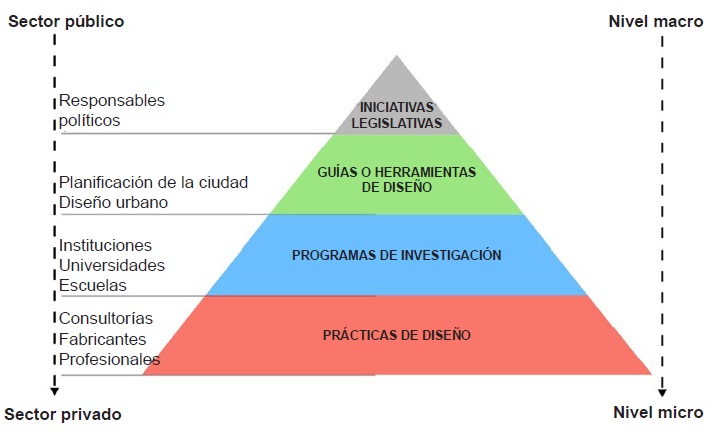 El modelo es relevante ya que, a pesar de estar propuesto para un país asiático, está en consonancia con los actores presentes desde el sector privado al público y con las escalas pertinentes en la planificación y prácticas de diseño. La pirámide contempla que se puedan establecer acciones conjuntas desde los responsables políticos con la promulgación de iniciativas legislativas en el nivel macro, seguida por acciones que apoyen al diseño urbano con las publicaciones de líneas rectoras y herramientas de diseño. Estas líneas y herramientas pueden ser la base de estudio y análisis de las instituciones, universidades y escuelas por medio de sus programas de investigación, con la finalidad de generar el conocimiento más acertado al contexto particular de cada ciudad, y así poder entrenar a profesionistas, consultorías y fabricantes en las mejores intervenciones en la práctica de diseño para personas reales en la vida real. “A través de la participación de las cuatro partes en la pirámide, se podría construir un ambiente exterior más feliz y más seguro” (Lu y Zhang, 2017, p. 182).