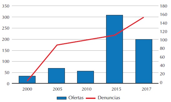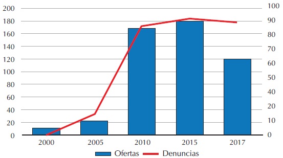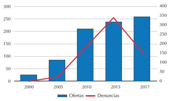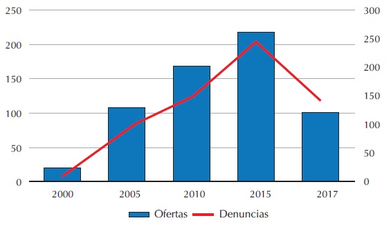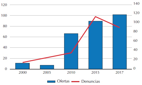 Por el lado de las denuncias ciudadanas, entre 2000 y 2005 se presentaron únicamente cinco. Recordemos que durante este periodo la oferta vertical no tuvo gran crecimiento sino hasta 2010. A partir de este año, el número de denuncias ciudadanas aumentó a 66, mientras que para 2015 alcanzó un total de 89, y en 2017 tuvo un ligero aumento a 101 denuncias.