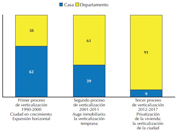 | I. Ciudad en crecimiento: expansión horizontal 1990-2000 | II. Auge inmobiliario: verticalización temprana 2001-2011 | III. Privatización de la vivienda: verticalización de la ciudad 2012-2017 | |||||