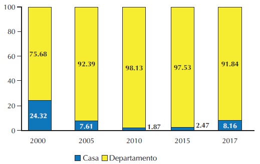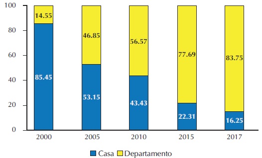 Esta dinámica cambió para los siguientes quinquenios, y en 2005 se ubicaba en departamentos el 59.46% del total de la oferta inmobiliaria, mientras que la oferta de casas se reducía. Sin embargo, para 2010 esta tendencia se aceleró evidenciando un cambio abrupto en la relación entre casas y departamentos. La oferta inmobiliaria vertical de departamentos concentró en 2010 un 96.02%, dejando únicamente el 3.98% del total de la oferta en la tipología de casas. Este porcentaje y tendencia continuó para 2015 y 2017, y la vivienda en departamento concentró 97.84 y 98.33% del total (Gráfica 10).