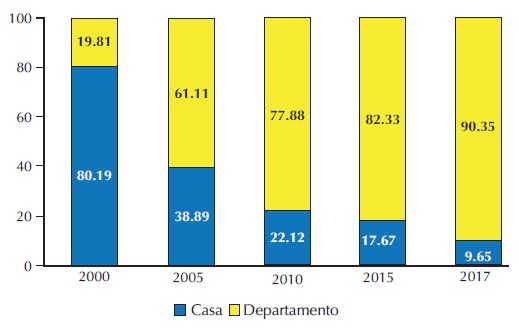 El proceso de expansión evidenció la salida de población de zonas centrales (Coulomb, 2008) y el crecimiento poblacional en alcaldías del segundo y del tercer contorno (Delgado, 1990) y de los municipios de la zona metropolitana (Lara et al., 2017; Suárez y Delgado, 2007). En este periodo, el 62% de las ofertas inmobiliarias se concentraron en la categoría de casas, mientras que el restante 38% en departamentos (Gráfica 1).