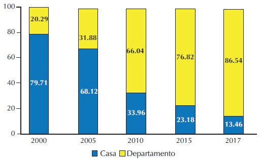 Esta relación cambió radicalmente en 2005, cuando el 61.11% de la vivienda en departamento se convirtió en la tipología dominante, dejando las ofertas inmobiliarias de casas con sólo 38.89%. Este patrón siguió en los siguientes años: para 2010 el 77.88% del total de las ofertas inmobiliarias correspondía a oferta vertical, en 2015 aumentó a 82.33, y para 2017 a 90.35% (Gráfica 6).