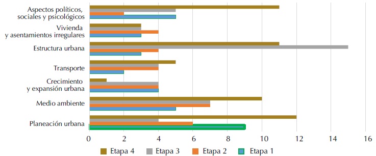El peso de cada una de las categorías utilizadas varía de acuerdo con las etapas consideradas: en la primera, la planeación urbana lleva la delantera con casi 26% del total, siguiéndole en importancia el tema ambiental y los aspectos políticos sociales y culturales, mientras que el menos tratado se refiere al transporte. En la segunda etapa la temática ambiental toma la delantera, antes de planeación urbana y gestión municipal, disminuyendo mucho en cambio los aspectos políticos y psicosociales. La tercera etapa muestra un cambio bastante notable en el peso de las categorías utilizadas, con un predominio fuerte de los trabajos sobre estructura urbana, que representan más de 30% del total, siguiendo las investigaciones sobre medio ambiente con un porcentaje mucho más bajo, de alrededor del 15%, y una disminución notable de los trabajos referidos a planeación y gestión, que habían sido mucho más frecuentes con anterioridad. En la última etapa los estudios de caso representan el 60% del total de los artículos publicados, y dentro de éstos, la gestión urbana vuelve a ocupar un lugar relevante con más del 20% del total, le sigue estructura urbana, aunque ya no con tanto peso, y aspectos políticos, sociales y psicológicos. Los trabajos sobre problemas ambientales bajan al tercer lugar.
