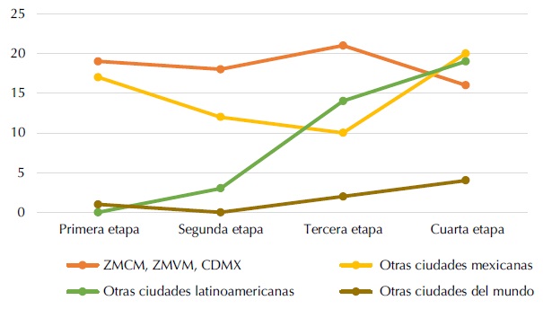 En cuanto a los lugares involucrados en los análisis, también en las dos primeras etapas predominan ampliamente referencias a la Ciudad de México, y en las dos siguientes se multiplican sobre todo las de otras ciudades mexicanas (como Puebla, Guadalajara, Puerto Vallarta, Ciudad Juárez, Mexicali) y de urbes de otros países como España, Argentina y Colombia.