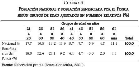 Algo semejante ocurre cuando se analizan los recursos otorgados de acuerdo con los grupos poblacionales de edad. Según la información proporcionada por el Fonca, de 1989 hasta el año 2006 el porcentaje de beneficiarios de sus programas individuales en cada grupo etario ha sido el que refleja el cuadro 3.31