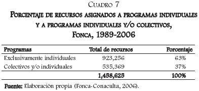 Los datos del cuadro 7 son claros: de manera significativa se destinan más recursos a los individuos (63%) que a los proyectos colectivos (37%). En resumen, se puede sostener que el Fonca, en contra de la propuesta de descentralización marcada como parámetro de la modernización de la política cultural, lleva a cabo una política de concentración de los recursos en tres rubros: