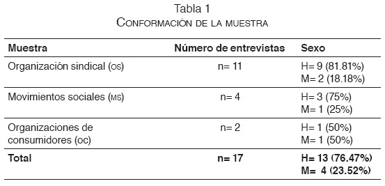 Los objetivos abordados en esta investigación fueron: a) describir la noción de desarrollo social y económico que poseen las organizaciones sociales y ciudadanas; b) caracterizar el concepto de lucro y el rol de las empresas en el desarrollo económico y social del país desde el punto de vista de las organizaciones sociales y ciudadanas; y c) observar posibles puntos de encuentro entre la acción de la sociedad civil y la de las organizaciones empresariales que posibiliten la creación de valor compartido. Los objetivos fueron abordados con un diseño de carácter no experimental, exploratorio, correspondiendo específicamente a una investigación social cualitativa (Flores, 2009; Hernández, 1994; Vallés, 2002). La muestra estuvo constituida por 17 dirigentes de organizaciones formales y movimientos ciudadanos que representan a trabajadores, consumidores y grupos de protesta que realizan diversas demandas de protección y/o mejoramiento de los derechos laborales, del medio ambiente, la salud y la educación. A todos ellos les aplicamos una entrevista semiestructurada con el fin de indagar nuestros objetivos, tal como se sugiere en los manuales de investigación social cualitativa, donde el muestreo es intencionado, combinando los criterios de homogeneidad y de heterogeneidad (Strauss, 1987; Strauss y Corbin, 2002; Valles, 2002).