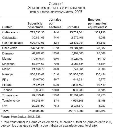 4 Para elaborar el cálculo se consideró la superficie cosechada, así como el número de empleos generados por hectárea que elaboró el Programa Nacional de Jornaleros Agrícolas en 2007, y se tomó en cuenta que un empleo permanente es igual a 250 jornales al año. El número de ocupados en la agricultura es muy superior, ya que el calculado sólo consideró empleos de tiempo completo a lo largo del año.