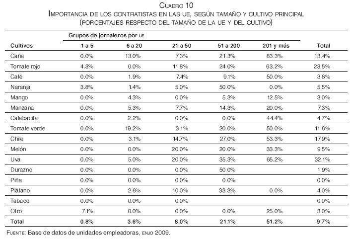 En el caso del tomate verde, del chile y de la uva, los contratistas son importantes en casi todos los tamaños de UE, aun cuando la incidencia es menor en las empresas de mayor tamaño. En el cultivo del chile verde se observa que el 14.7% de las UE de 21 a 50 trabajadores utilizan contratistas; el 27% de las que requieren de 51 a 200 también lo hace; y el 53.3% de las que tienen más de 200 también echa mano de esta opción.