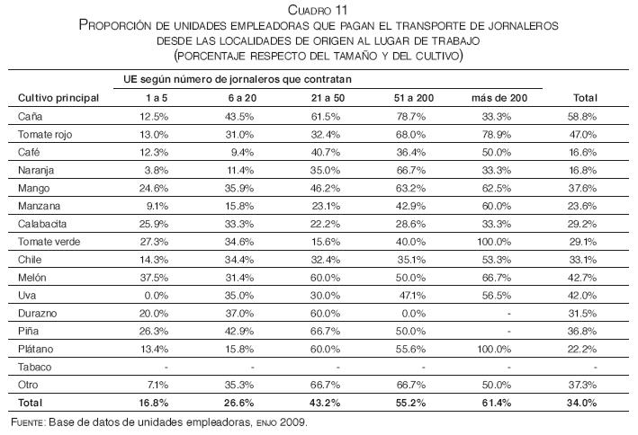 Entre las empresas que contratan de uno a cinco trabajadores, sólo el 16.8% paga el traslado de sus jornaleros; en las de seis a veinte, esta acción la realizan el 26.6%; entre las de cincuenta a 200, el 55.2% lo hace; y finalmente, entre las de más de 200 trabajadores, el 61.4% paga el transporte.14