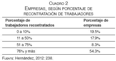 Entre las empresas que configuran el mercado de trabajo rural, una proporción importante reconoce que ocupa a sus trabajadores por más de un mes y hasta diez meses, y en su mayoría los recontrata al año siguiente. Sin embargo, la falta de vigilancia por parte de la Secretaría del Trabajo permite que no se cumpla con lo establecido en la Ley del Trabajo para garantizar la estabilidad en el empleo.