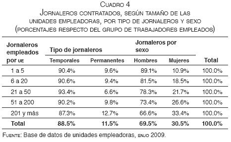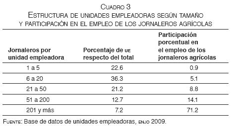 En la información que la ENJO 2009 arrojó, el mayor número de unidades empleadoras lo constituyen las empresas agrícolas que contratan de seis a veinte trabajadores, lo cual representa el 36.3%. El segundo lugar es ocupado por las empresas que contratan de uno a cinco jornaleros; mientras que las empresas que contratan a más de cincuenta trabajadores representan el 19.9% del total. Por número de UE las más grandes suman un porcentaje relativamente reducido, pero por número de trabajadores absorben más de 70% de los jornaleros.