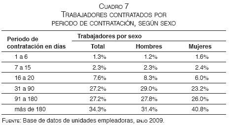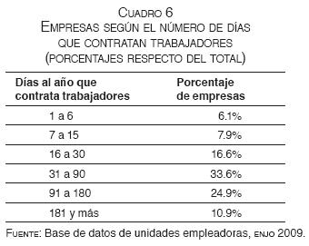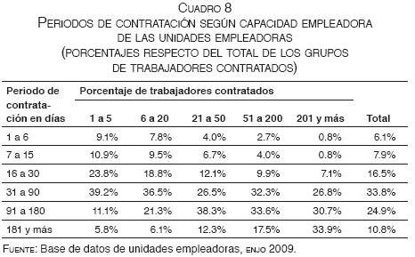 Las UE de uno a cinco trabajadores ofrecen las condiciones de trabajo más precarias, ya que el 43.8% de las mismas otorga trabajo por periodos de uno a treinta días lo hace por espacios de tiempo discontinuos; su demanda es apenas perceptible, por lo que tiene pocas posibilidades de promover la aglomeración, y por ello la búsqueda de trabajo es más azarosa para los jornaleros. Todo esto necesariamente incrementa el costo de transacción en el intento por encontrar trabajo y no representa un incentivo para los jornaleros. La elevada intermitencia y la corta duración de la relación laboral es un factor que dificulta los mecanismos de supervisión de este tipo de empresas por parte de los organismos laborales y de seguridad social. Lo reducido de los periodos de contratación les permite que, aun cuando contraten trabajadores por fuera de las normas legales, incluso cuando estas empresas sean sorprendidas, la ley las protege de su incumplimiento, porque no cubren los periodos de contratación suficientes que las obligue a dar parte a los organismos de seguridad social, ya que sólo se encuentran obligadas a reportar las cuotas en forma mensual, y su pago se realiza por meses vencidos.