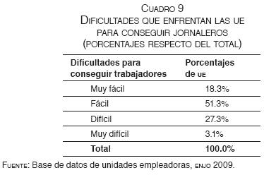 Dichos procesos permiten que en la actualidad el 60.6% de los productores no encuentran dificultades para conseguir los jornaleros que requiere la operación de su unidad productiva. Para el 27.3% de los empleadores conseguir jornaleros presenta cierto grado de dificultad, y sólo para el 3.1% esto representa una actividad muy difícil (véase Cuadro 9).