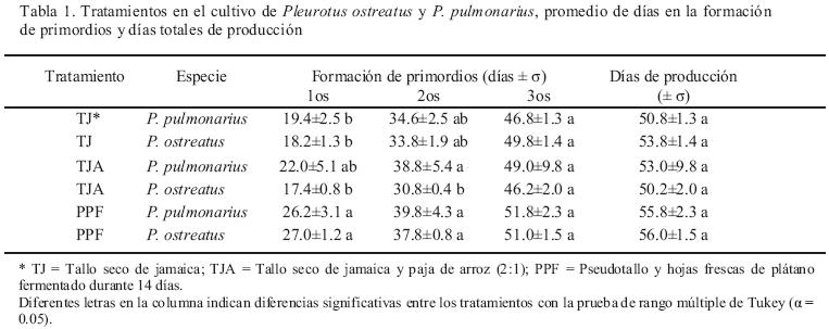 Los primeros primordios fueron más precoces en TJA con la cepa IE8 y en TJ con ambas cepas al desarrollarse a los 17.4, 18.2 y 19.4 días de incubación, respectivamente y fueron superiores estadísticamente al resto, debido a que en los tratamientos TJA con la cepa IE4 y PPF con ambas cepas, requirieron de 22.0, 26.2 y 27 días, respectivamente. En la formación de los segundos primordios el tratamiento TJA (30.8 días) con la cepa IE8 fue estadísticamente superior al resto de los tratamientos. Sin embargo, tanto en la formación de los terceros primordios (46.2 a 51.8 días) como en el total de días de producción (50.2 a 56.0 días) no hubo diferencias significativas, por lo cual, las cepas y substratos se comportaron de manera similar en estas dos variables (Tabla 1).