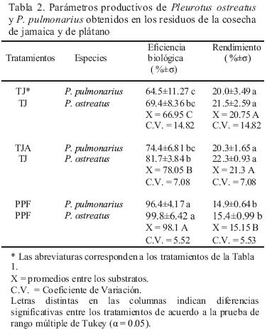 Se cultivaron dos cepas: Pleurotus ostreatus y P. pulmonarius sobre tallos secos de la jamaica (Hibiscus sabdariffa) (TJ) y en mezcla con paja de arroz (Oryza sativa) en una proporción 2:1 (TJA) y pseudotallo con hojas frescas de plátano (Musa paradisiaca) (PPF). La más alta productividad se obtuvo en el sustrato PPF con eficiencias biológicas (EB) de 96.4 y 99.8% y con rendimientos (R) de 14.9 y 15.4%. En los otros sustratos los parámetros fluctuaron entre 64.5 a 81.7% de EB, y de 20.0 a 22.3% de R.