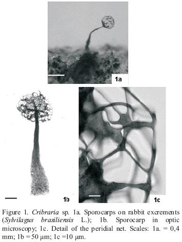 Cosmopolitan, with records for Amazonas, Bahia, Ceará, Paraíba, Ceará, Paraíba, Paraná, Pernambuco, Piauí, Paraná, Rio de Janeiro, Roraima and São Paulo [6; 17; 22]. This species is very common and widely distributed in the world and in Brazil, being frequently found on rotting wood, acting like a lignicolous species. This is the first record, at a global level, of this species as fimicolous [10, 19]. Rabbit feces in which sporocarps of C. cancellata appeared were collected at the end of the dry season (April), in an area of savanna of the PNSI. During four months, only plasmodial tracks were observed in a moistchamber that, rehumidified after nine months of dehydration, developed typical sporangia in a little more than seven weeks of cultivation.
