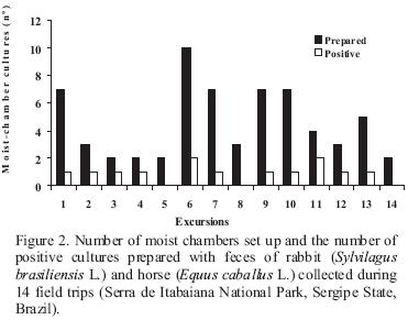 Moistchamber cultures were prepared from samples of feces of horse (Equus caballus L.) and of tapeti, the Brazilian rabbit (Sylvilagus brasiliensis L.). Tapeti is a species in the Leporidae considered threatened with extinction; it inhabits fields, forests and savannas, and eats fruits, shoots and leaves.