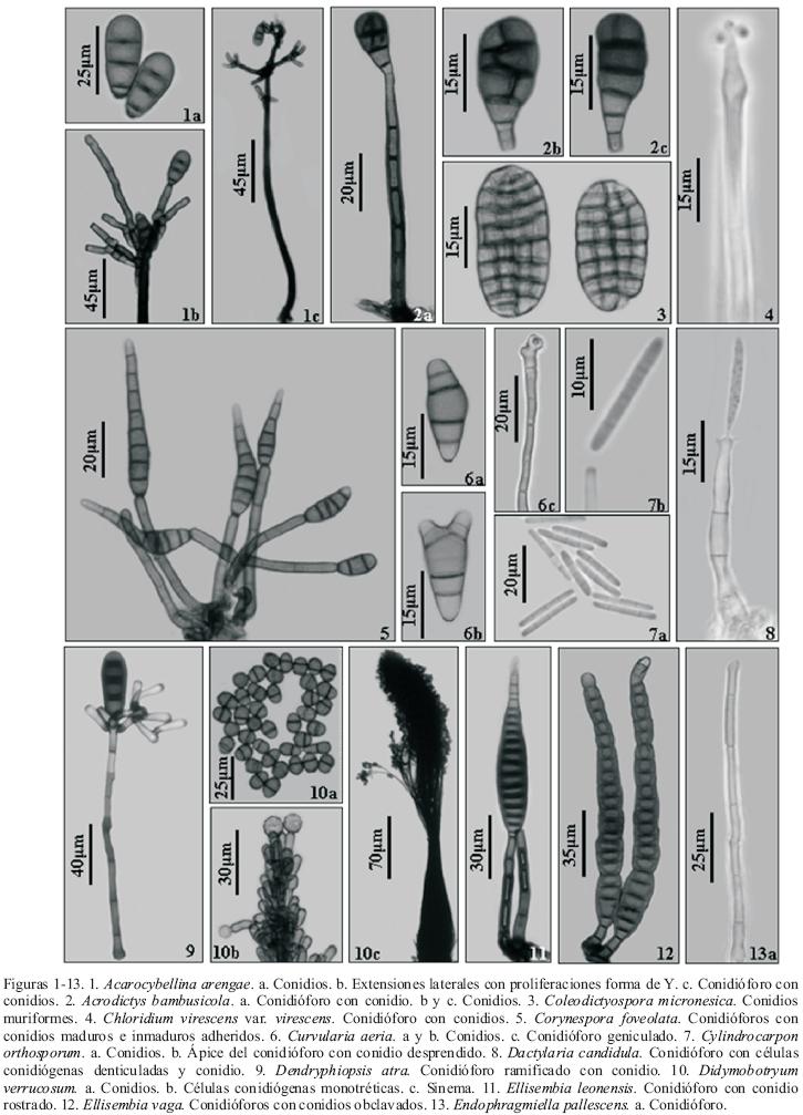 Colonias dispersas, pilosas, pardas. Micelio parte superficial y parte inmerso; hifas ramificadas, lisas, septadas, hialinas. Conidióforos macronematosos, solitarios, erectos, rectos, ramificados, cilíndricos, lisos, septados, pardo rojizos, 178.5219 x 68 µm; con proliferaciones sucesivas en forma de Y, en la célula basal de la proliferación se produce una extensión lateral hacia abajo de forma curva la cual crece adherida al estípite principal. Células conidiógenas monotréticas, discretas, terminales, determinadas, cilíndricas, lisas, pardas. Conidios solitarios, secos, ácrogenos, obovoides, lisos, 3septos, pardos, 23.532.5 x 1114 µm; base truncada.