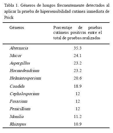 Los géneros fúngicos más frecuentemente detectados por las reacciones cutáneas de hipersensibilidad inmediata positivas fueron: Alternaría (35.3%), Mucor (24.1%), Aspergillus (23.2%), Hormodendrium (23.2%), Helmintosporium (20.6%) y Candida (18.9%) (Tabla 1).