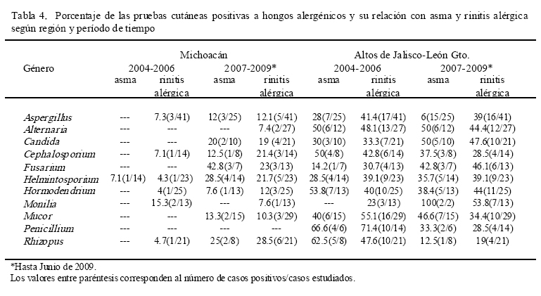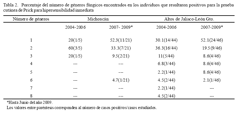 En Michoacán se realizaron 87 pruebas de las cuales 26 resultaron positivas a alérgenos fúngicos (29.88%). La sensibilización para el periodo 2004-2006 fue de 19.23% y para el periodo 2007-Junio 2009 fue de 80.76%. En los Altos de Jalisco- León Gto se realizaron 125 pruebas, resultando 90 pruebas positivas a algún tipo de alérgeno fúngico (72 %). La sensibilización para el periodo 2004-2006 fue de 48.88% y para el periodo 2007-Junio 2009 fue de 51.11%.