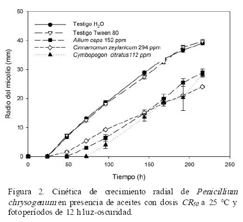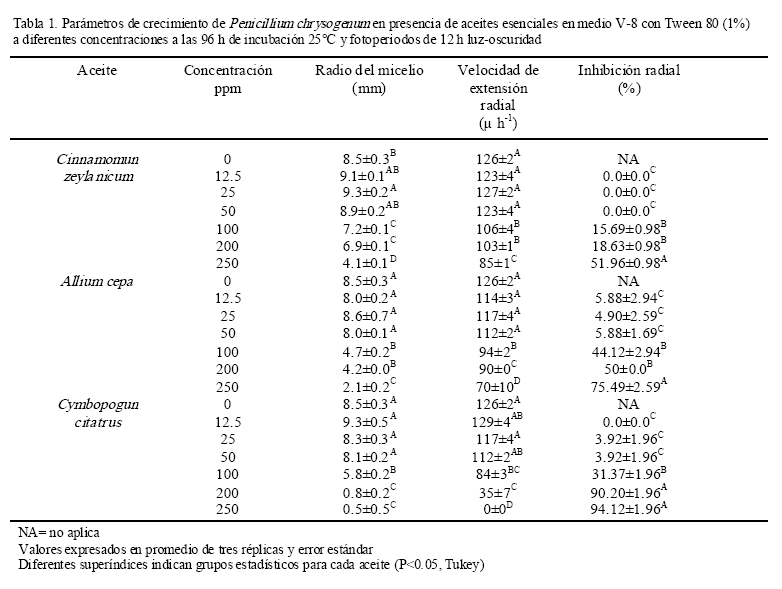 Se utilizó una cepa de P. chrysogenum de la colección del Laboratorio de Microbiología del Departamento de Investigación y Posgrado en Alimentos de la Universidad de Sonora. La cepa se cultivó en medio de cultivo V-8 estéril (jugo V-8 200 ml, CaCO3 3 g/L y agar 15 g/L), incubándose a 25 °C con fotoperiodos de 12 horas luz-oscuridad, por 96 h. Las esporas producidas se suspendieron en 20 ml de solución Tween 20 (0.1%) mediante agitación magnética por 5 minutos. Para la determinación del número de esporas por ml de solución se empleó una cámara de Neubauer y las diluciones de esporas obtenidas se guardaron en refrigeración (5°C) hasta su uso. Se evaluaron tres aceites esenciales comerciales (Aldrich) identificados como aceite de canela (Cinnamomum zeylanicum) (hojas), aceite de té de limón (Cymbopogon citratus) (Guatemala) y aceite de cebolla (Allium cepa) (México). Para evaluar la actividad antifúngica de la cepa de P. chrysogenum, al medio V-8 se le adicionó Tween 80 hasta una solución final del 1%, la mezcla se agitó y esterilizó en autoclave. Se dejó enfriar a 45 °C y se le adicionó el aceite, mezclando y depositando de 8 a 10 ml en cajas de Petri de 5 cm de diám. Los tratamientos constaron de seis concentraciones (12.5, 25, 50, 100, 200 y 250 ppm) para cada aceite. Además se prepararon testigos sin aceite esencial, testigo H2O y testigo Tween 80 al 1%. Posteriormente mediante el análisis Probit se obtuvo la concentración mínima inhibitoria que disminuye el crecimiento radial en un 50% con respecto al testigo (CR50) para cada aceite, a partir de las cinéticas de crecimiento radial y porcentajes de inhibición. Cada tratamiento de aceites y testigos se inoculó con la técnica reportada por Plascencia-Jatomea et al. (2003) y modificada de la siguiente manera: con una pipeta Pasteur se realizó una perforación de 6 mm de diámetro en el centro del medio de cultivo contenido en placa de Petri, posteriormente se inoculó el microorganismo a una concentración de 105 esporas. Los cultivos se incubaron a 25 °C, con fotoperiodos de 12 horas luz-oscuridad. El diámetro del micelio desarrollado se midió cada 12 h. Se compararon los resultados del crecimiento del hongo con el medio testigo Tween 80 y se calculó el porcentaje de inhibición sobre el crecimiento radial del micelio con la ecuación descrita por Guo et al. (2008). La velocidad de extensión radial del micelio U (μm/h), se obtuvo a partir de la pendiente obtenida de graficar los datos experimentales en la etapa de crecimiento micelial en relación con el tiempo. El experimento se realizó por triplicado.