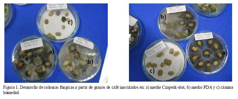 Para observar qué medio favorecía el crecimiento fúngico de los hongos de interés, se colocaron granos de café en cajas petri con agar papa dextrosa (PDA), con agar Czapek y en cámara húmeda, en relación de 10 granos por caja, para posteriormente ser incubadas durante 2 a 7 días a 27 °C. Se realizaron las resiembras necesarias para obtener cultivos puros y proceder a su identificación por observación morfológica (NOM-111-SSA1-1994; Carrillo, 2003).