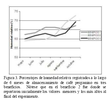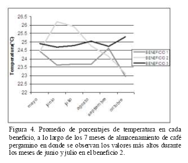 Como era de esperarse, en los tres beneficios se encontró un incremento en la concentración de OTA (Tabla 1), apoyando la hipótesis de que tanto la temperatura como la humedad son dos factores influyentes para la síntesis de ocratoxinas, lo cual coincide con los mayores incrementos de concentraciones de ocratoxinas, y con los valores más altos de humedad y temperatura del beneficio 2 (Figuras 3 y 4), durante el almacenamiento del café, coincidiendo con lo descrito por Denli y Pérez (2006). Dicho beneficio reportó los valores iniciales más bajos y los finales más altos de humedad relativa, así como el mayor rango de aumento de temperatura, en los meses de junio y julio, mientras que el beneficio 1, que fue el que presentó menor variación en los incrementos de humedad y temperatura, mostró el menor aumento en la concentración de ocratoxinas (1.74 ppm). No obstante, la humedad relativa siempre fue superior al 60 %.