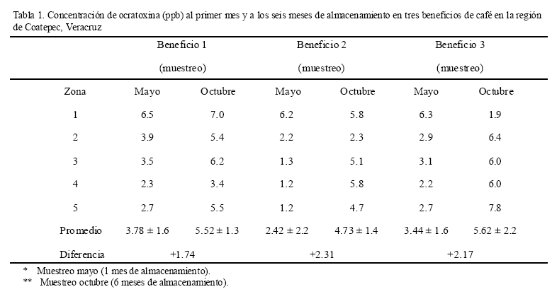 El 100 % de las muestras de café analizadas presentó contaminación con ocratoxinas A con valores que fluctuaron desde 1.2 a 7.8 ppb, para los dos muestreos (Tabla 1).
