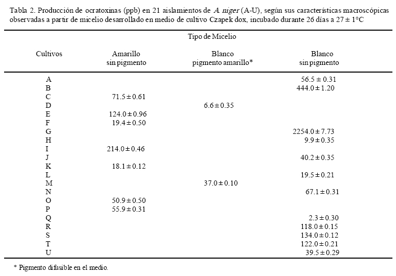 En contraste, los cultivos de micelio blanco sin pigmentación en el medio, produjeron concentraciones mayores de OTA y fueron además, los aislamientos más encontrados. Así, como se puede notar, el 100 % de los aislamientos fueron productores de ocratoxinas en medio de cultivo; no obstante, la potencialidad de cada uno de ellos varió, al obtenerse valores desde 6.6 ppb hasta 2254.0 ppb de ocratoxina A por aislamiento (Tabla 2).