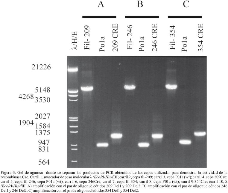 Análisis de las transformantes. Para la actividad Cre, se estudiaron las transformantes primeramente por auxotrofía a uracilo y posteriormente a 5 clonas de cada trasformación se analizaron por PCR, amplificando un segmento blanco limitado por un par de oligonucleótidos específicos, diseñados hacia las zonas que flanquean el sitio donde el mTnYl1 estaba insertado en el genoma (Tabla 1, Figura 2). El análisis consistió en comparar el tamaño del segmento amplificado, entre la cepa parental (P01a), la mutante (Fil) y la mutante transformada con Cre (FilCre). En un estudio previo, Richard et al., (2001), reportaron que existe una diferencia de tamaños entre la cepa parental y la mutante de aproximadamente 4.5 Kb que corresponde al tamaño del mini transposón utilizado (Figura 2). El segmento amplificado en la mutante Fil después de la acción de Cre, fue sujeto a secuenciación para confirmar la correcta acción de la recombinasa Cre del fago P1 dentro de Y. lipolytica.